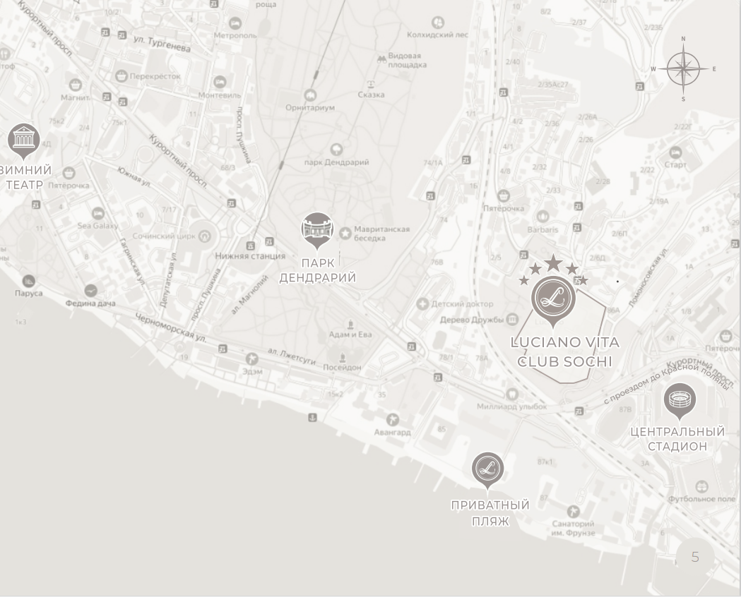 В самом сердце черноморского курорта под шелестом пальм и кипарисов расположен комплекс Luciano Vita Club Sochi. Это место, где каждый уголок дышит историей и природной красотой.